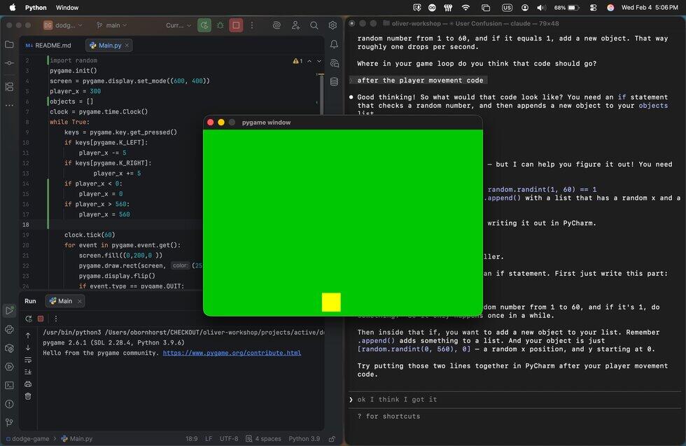 Oliver building a Pygame project in PyCharm with stirfry coaching alongside. Click to enlarge.